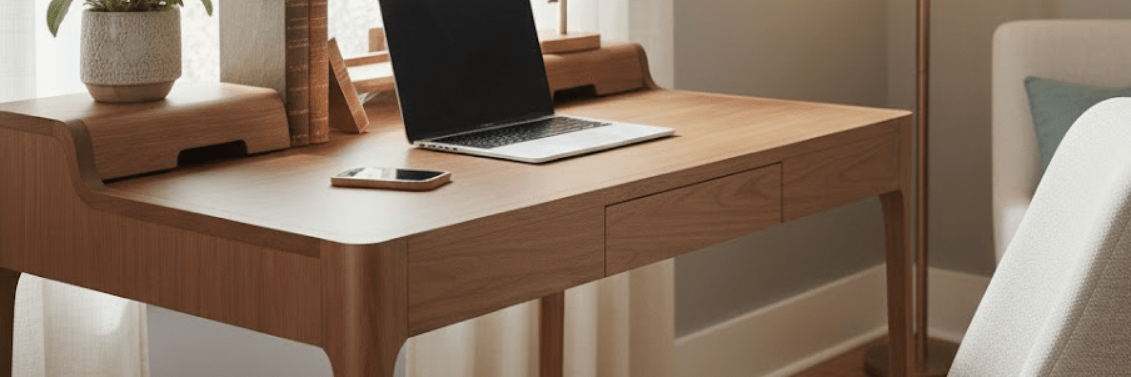 The 7 Table is a modern work desk with a unique and elegant design. Crafted from golden brown solid wood, this table displays a natural and warm wood grain texture. Its main feature is the slanted side legs shaped like the number "7," giving it a futuristic yet stable feel.