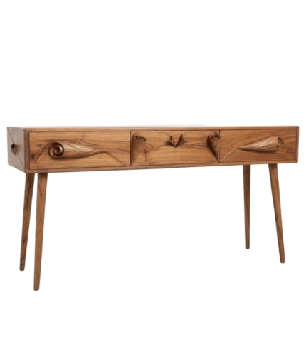 The Leaf Console Table is an exceptional piece of furniture that functions as a highly decorative accent or hall table. Constructed entirely from natural wood with a warm, pronounced grain, the table’s design is strongly focused on artisanal, organic details.