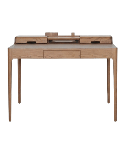 This Writing Desk is a sleek and modern piece that seamlessly integrates storage and functionality into a minimalist design. The entire desk is constructed from warm-toned wood (likely teak or walnut), featuring a smooth finish and continuous, rounded edges. It is supported by four tapered and slightly angled legs, which emphasize its Mid-Century Modern heritage. The main working surface is spacious and includes a central, shallow storage drawer. W x D x H = 134 x 65 x 82 (in cm) Available in wood material : – Mahogany – Sungkai – Jati/Teak – Oak Finishing color can be customized by the customer.
