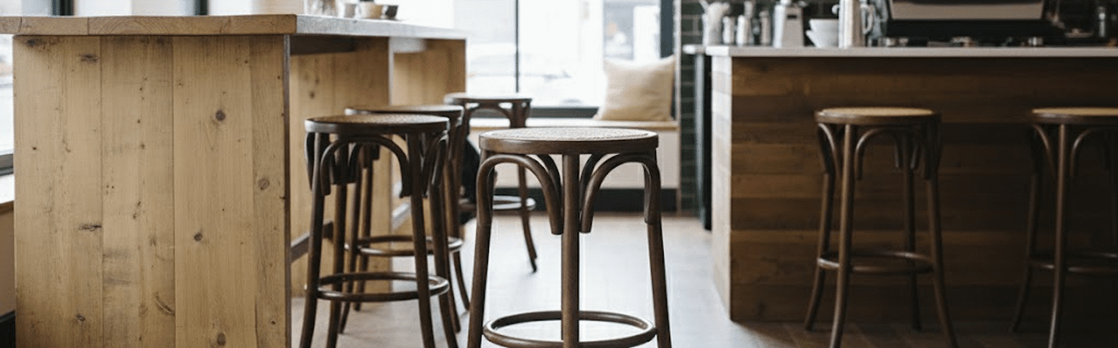 This Round Stool Rattan Seat is a classic piece of seating furniture, strongly reminiscent of the iconic bentwood designs popularized in the late 19th century. The frame is constructed from dark, richly stained bentwood, which creates a series of elegant curves.