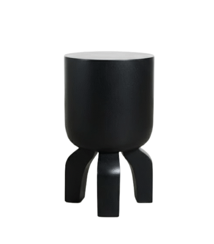 The Squidy Swar Stool is a whimsical yet minimalist sculptural piece that functions as a striking side table or pedestal. The piece is finished entirely in a deep, uniform matte black, giving it a strong, contemporary presence. It features a heavy, cylindrical main body supported by three distinctively curved, organic legs.