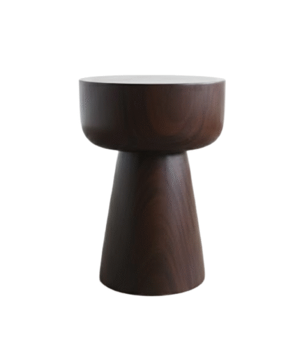 The Rounding Swar Stool is a sculptural and minimalist side table or accent stool that makes a bold statement through its geometric, turned form. It is constructed from solid wood and finished in a deep, dark stain (like walnut or dark teak), showcasing a rich color and smooth surface.