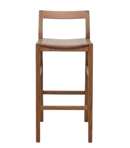 The Cola Bar Chair is a straightforward and sturdy high-backed bar stool that embodies clean, utilitarian design. It is constructed entirely from solid wood, featuring a warm, natural finish that showcases the wood grain. The chair has a simple, minimalist structure defined by straight lines and a comfortable, slightly curved backrest.