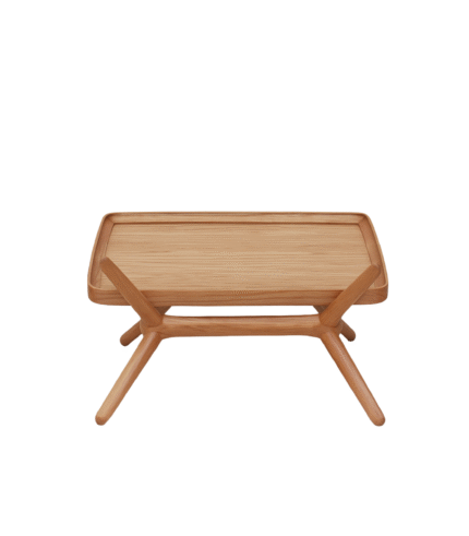 The ICS Side Table is a compact and highly functional piece distinguished by its tray-style top and dynamic base structure, blending utility with sculptural design. It is constructed from dark-stained wood, giving it a rich, warm, and sophisticated appearance.