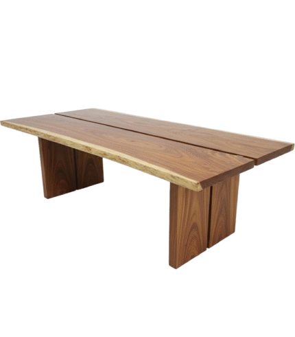 The Short Komunal Table is a magnificent, large communal or dining table that emphasizes natural, rustic materials and bold geometry. The tabletop is constructed from two wide slabs of rich, warm-toned wood (likely live-edge teak or suar wood) that run the length of the table. The edges retain their natural, raw curvature (live edge), adding organic character and charm. Instead of conventional legs, the table is supported by two massive, rectangular slab bases made from the same dark wood, which provide a heavy, grounded, and modern foundation.