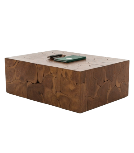 The Root Table is a bold, rustic, and highly sculptural coffee table that functions as a striking statement piece in any contemporary or natural-themed interior. Unlike conventional furniture, this table is constructed from numerous interlocking slices or blocks of rich, dark wood—likely teak or mahogany root sections—that have been meticulously fitted together to form a solid, rectangular block.