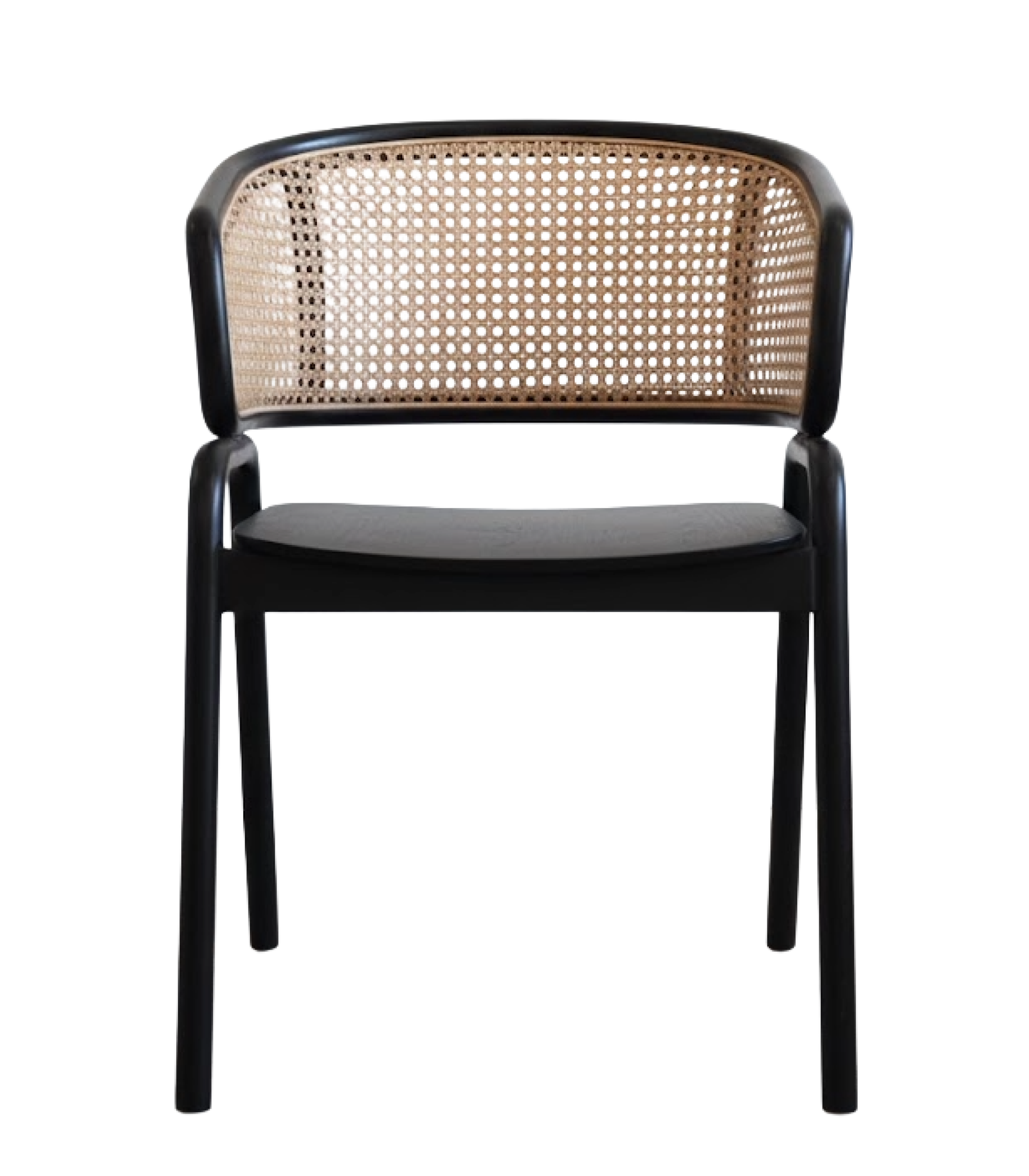 Mj Dinning chair features an elegant design with a natural wood frame and woven rattan seat and backrest. Its natural touch and ergonomic shape provide both comfort and warmth, perfect for a modern, natural, or Japandi dining room.