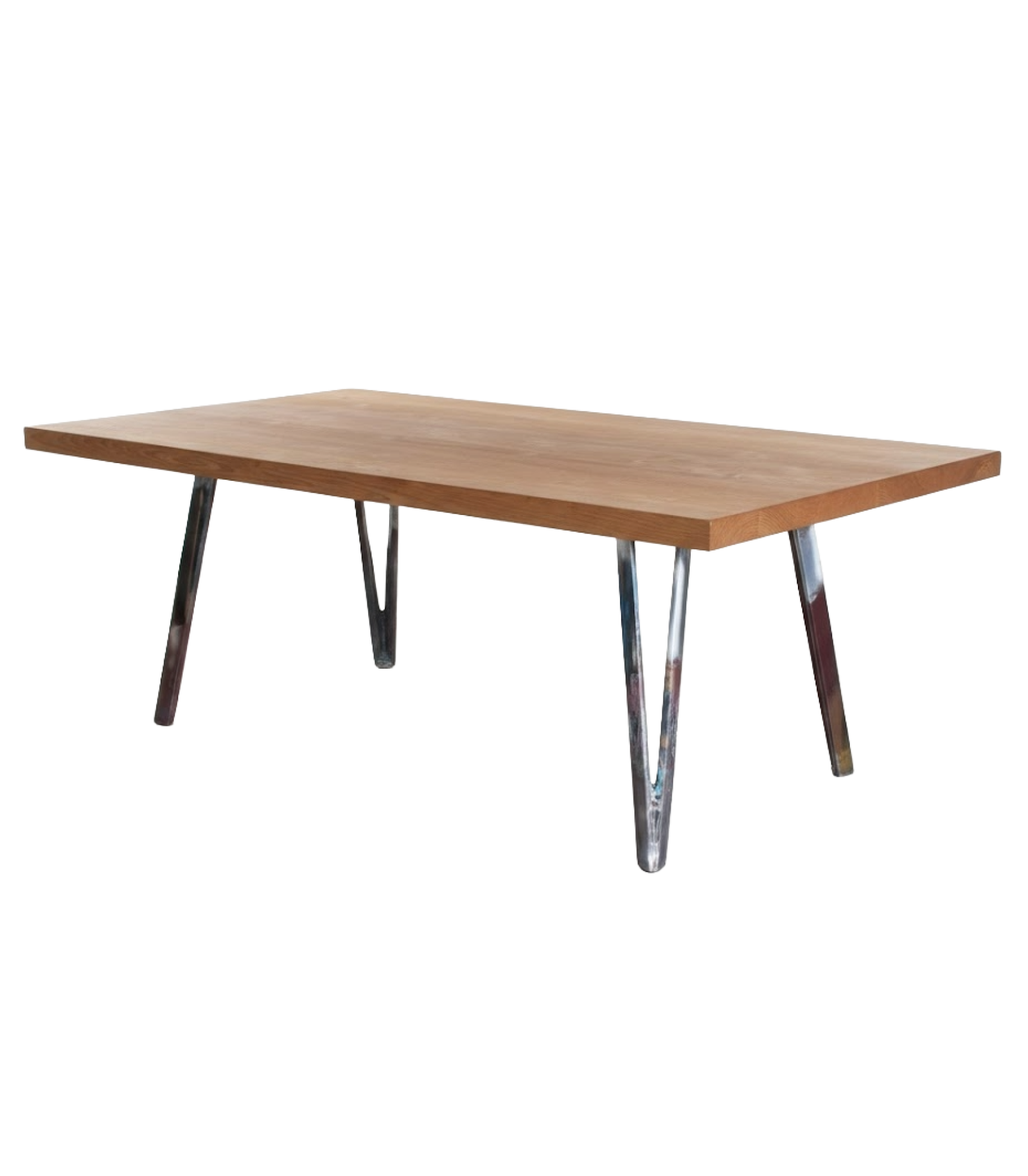 The Gyan Dining Table is a sleek, contemporary table that features a striking contrast between its natural wooden top and modern metallic base. The tabletop is a generous rectangle, constructed from warm-toned wood (likely teak or oak), showcasing a simple, clean, and unadorned surface. The table is supported by four hairpin-style V-shaped legs finished in a highly polished chrome or stainless steel.