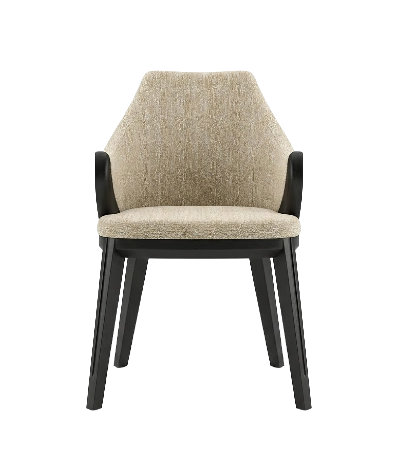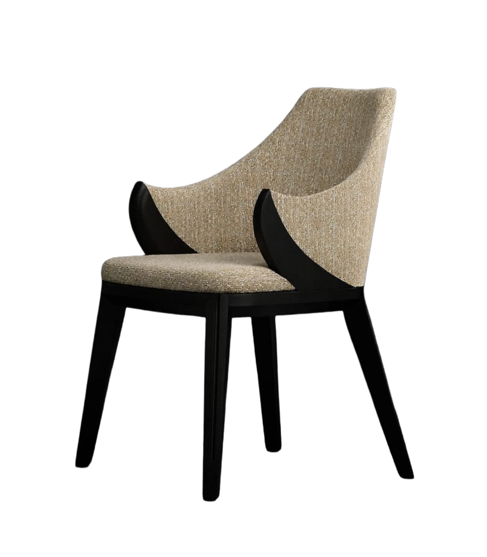 The Warangka Chair is a sophisticated contemporary armchair that masterfully blends sculptural wooden elements with plush upholstery. It features a sturdy frame finished in a deep, matte black that provides a sharp, elegant contrast to its light-toned seating. The chair is fully upholstered in a textured, beige-mélange fabric that covers the seat and the tall, gently curved backrest, ensuring both comfort and style.