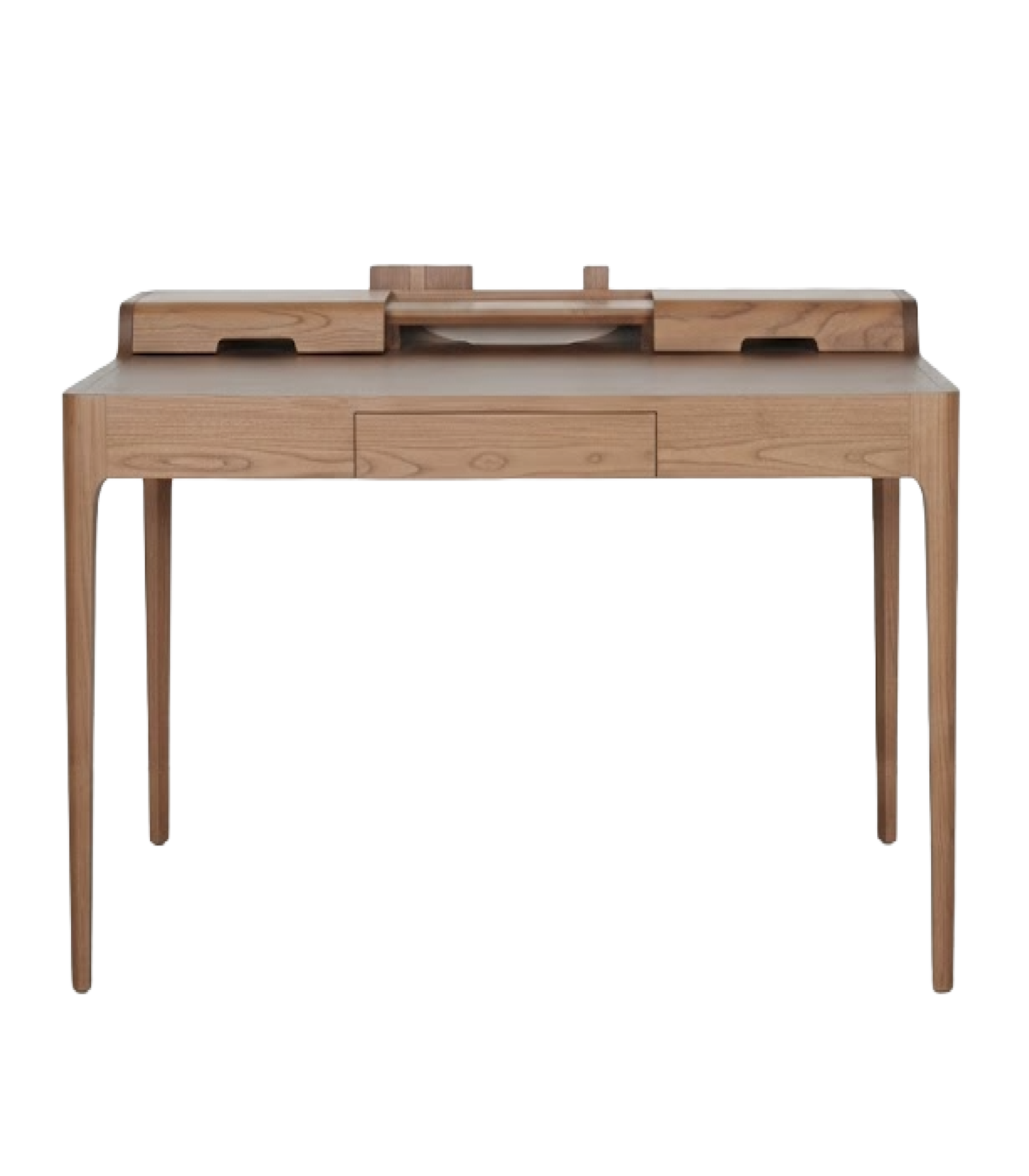 This Writing Desk is a sleek and modern piece that seamlessly integrates storage and functionality into a minimalist design. The entire desk is constructed from warm-toned wood (likely teak or walnut), featuring a smooth finish and continuous, rounded edges. It is supported by four tapered and slightly angled legs, which emphasize its Mid-Century Modern heritage. The main working surface is spacious and includes a central, shallow storage drawer.