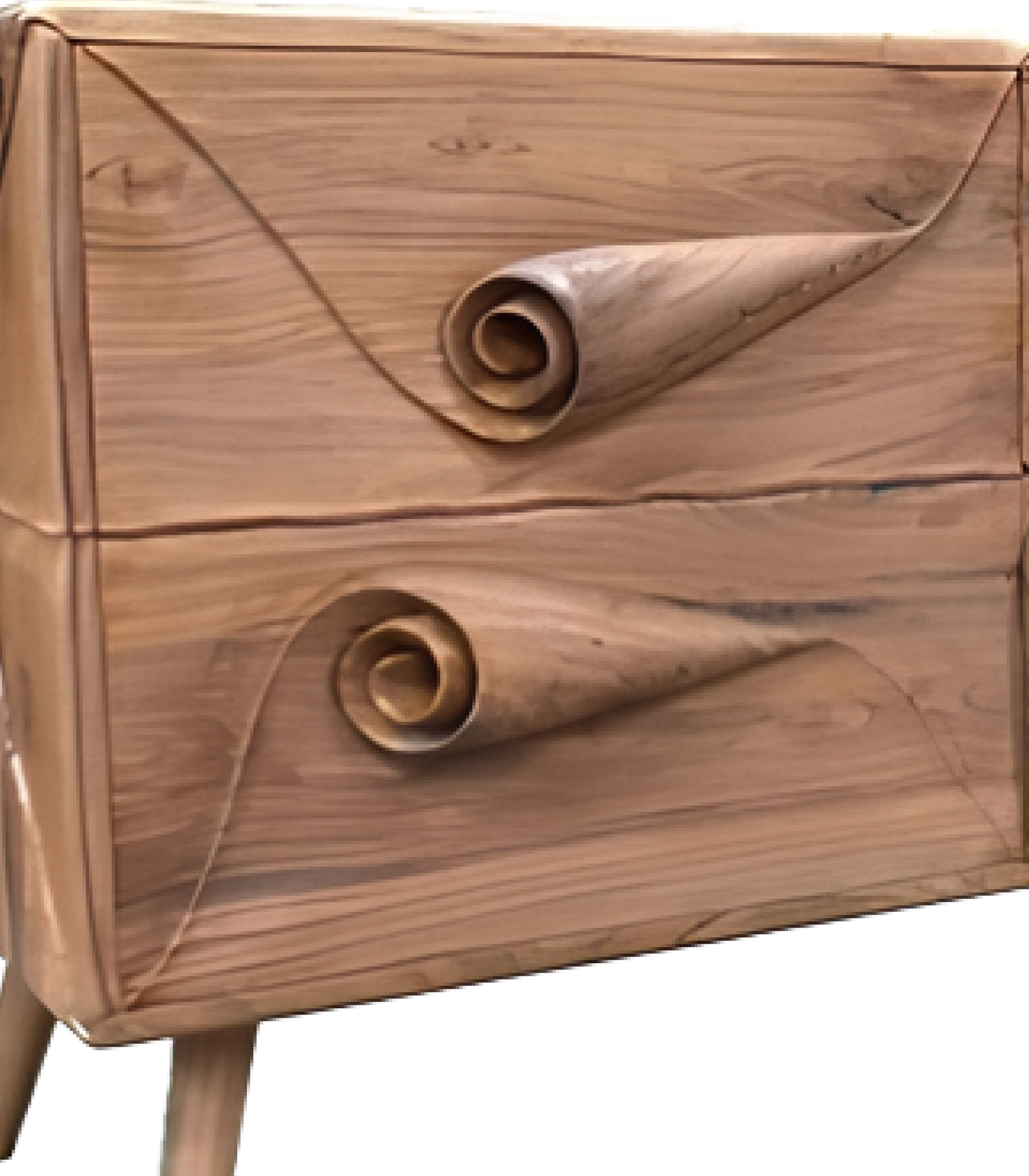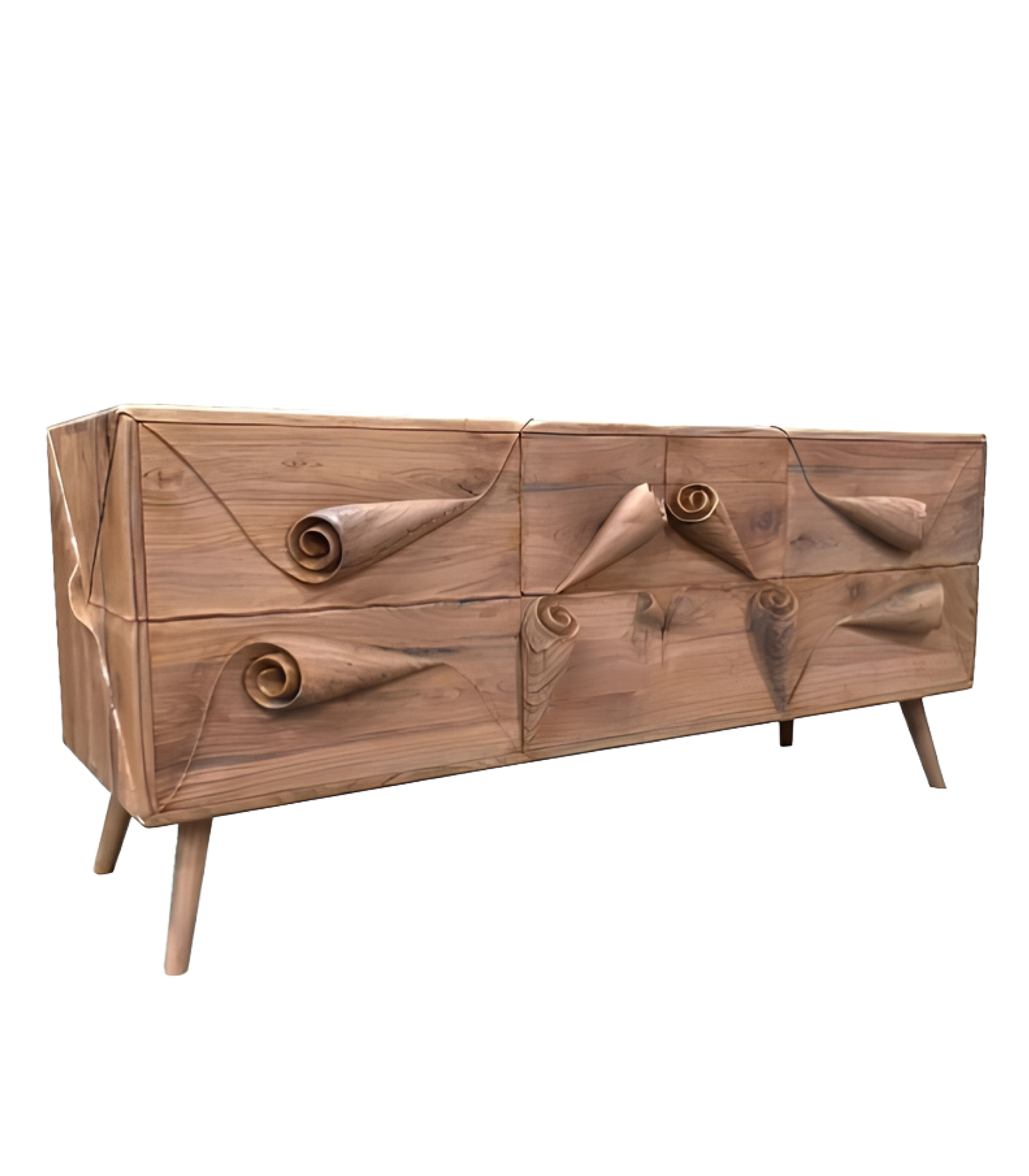 This cabinet boasts a unique and artistic design, blending classic style with contemporary touches. Crafted from warm brown solid wood, each drawer features scroll-shaped carved details that resemble sheets of wood folding outward. This decorative element is a distinctive feature, lending strong character and creating a work of art.